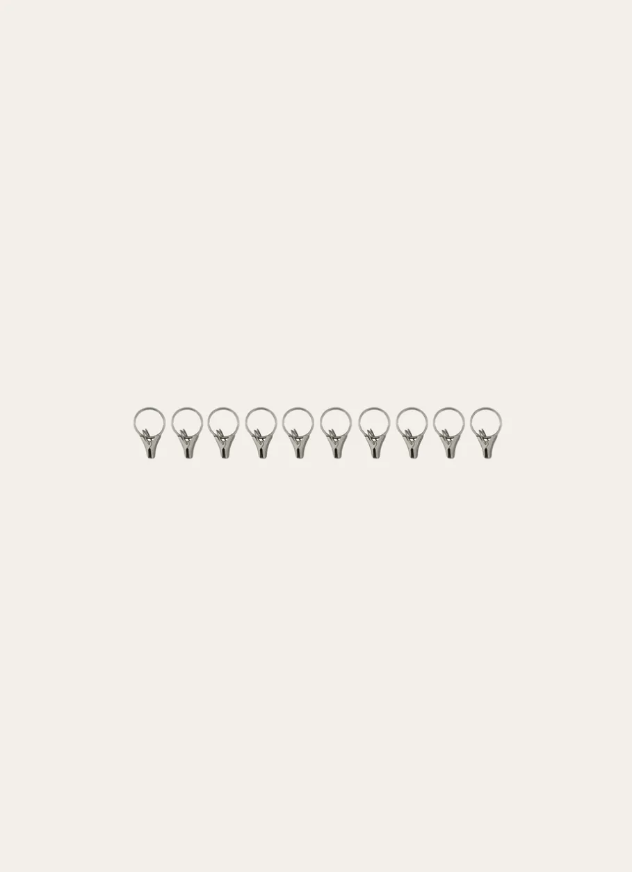 Lot de 10 anneaux en métal de petit diamètre avec pince pour accrocher les rideaux droits sans oeillets. Existe en plusieurs coloris : blanc, noir, argent et doré. Compatible avec des tringles jusqu’à 1,9 cm de diamètre, ce produit allie simplicité et polyvalence pour s’adapter à différents types d’installations. Dimensions (cm) : D2,2. Diamètre intérieur (cm) : 2.
