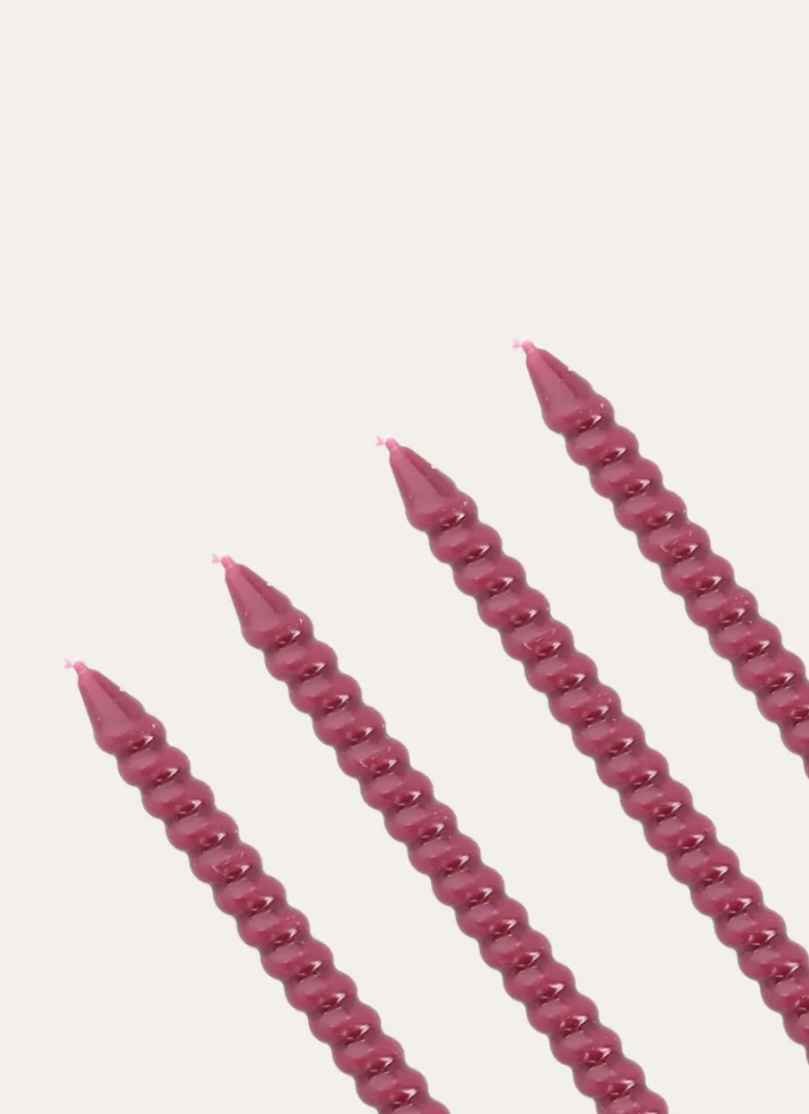 Lot de quatre mini bougies torsadées. On adore ! Dimensions (cm) : 18 x 1,4 Existent en plusieurs coloris.
