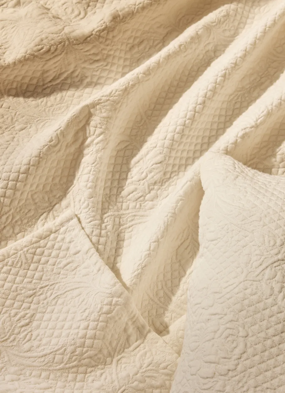 Dessus de lit en tissu jacquard à effet boutis provençal, motif floral surpiqué. Dimensions (cm) : 230 x 250.