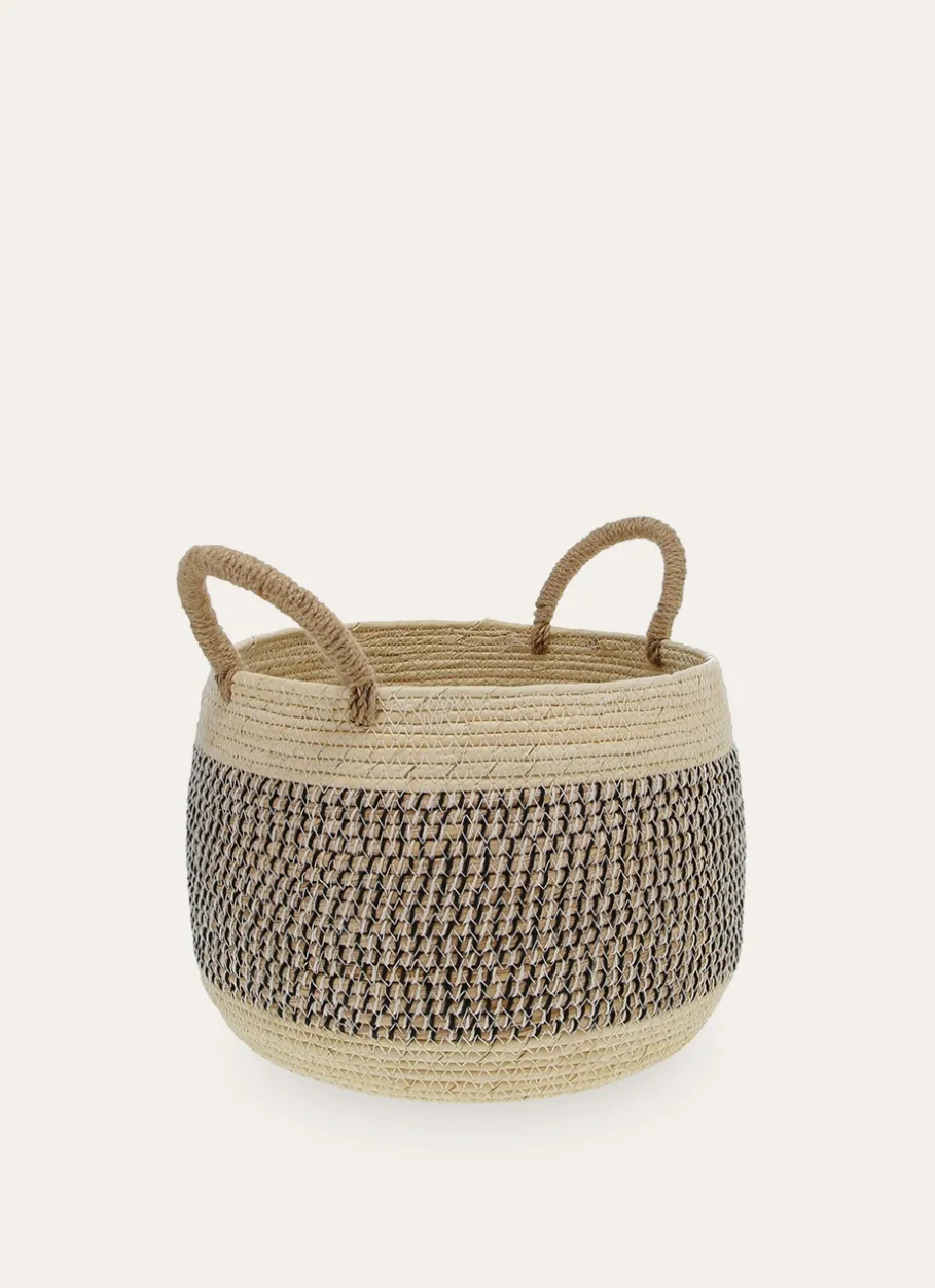 Panier rond en fibres naturelles, doté de deux anses en corde pratiques pour un transport facile. Son centre mélange harmonieusement des fils noirs et écrus, apportant une touche graphique et moderne à son style authentique. Parfait pour le rangement, comme cache-pot ou simplement en élément décoratif. Existe également dans un format plus grand pour un joli duo assorti.Dimensions (cm) : Ø 29 x H 23 (H 31 avec anses).