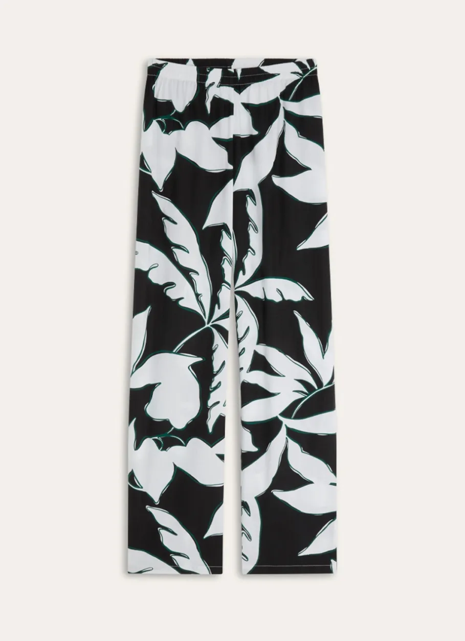 Ce pantalon droit à taille élastiquée est fabriqué en coton, avec un joli imprimé feuillage sur fond noir. Confortable et stylé, il s’adapte à toutes vos envies de looks. Le tee-shirt assorti est également disponible pour un total look.