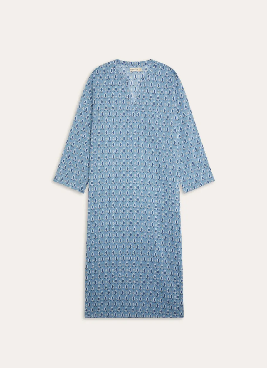 Cette robe longue en coton imprimé indien allie confort et élégance. Son imprimé girly bleu, inspiré des motifs traditionnels indiens, apporte une touche de fraîcheur et de féminité à votre garde-robe. Idéale pour les journées d’été, elle se porte aussi bien en journée qu’en soirée.