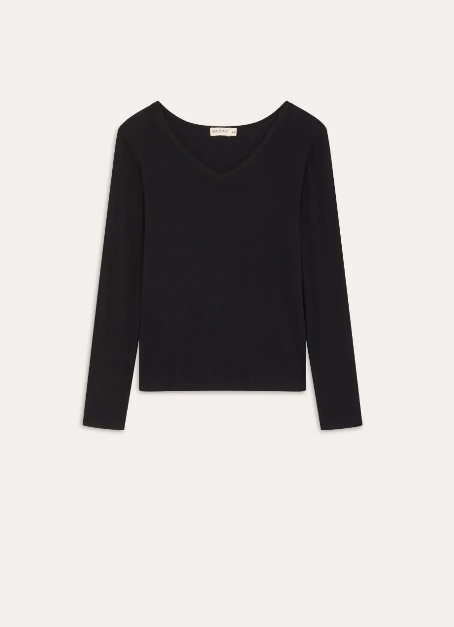 Découvrez notre shirt à manches longues en viscose élasthanne, conçu pour offrir un confort optimal tout au long de la journée. Sa matière douce et agréable à porter épouse délicatement les formes, garantissant une sensation de bien-être.Le détail en dentelle sur l’encolure ajoute une touche d’élégance, faisant de ce shirt une pièce polyvalente, idéale pour diverses occasions.Disponible dans une large gamme de tailles, du 34/36 au 50/52, il s’adapte à toutes les morphologies. Choisissez entre deux coloris intemporels : noir et écru.