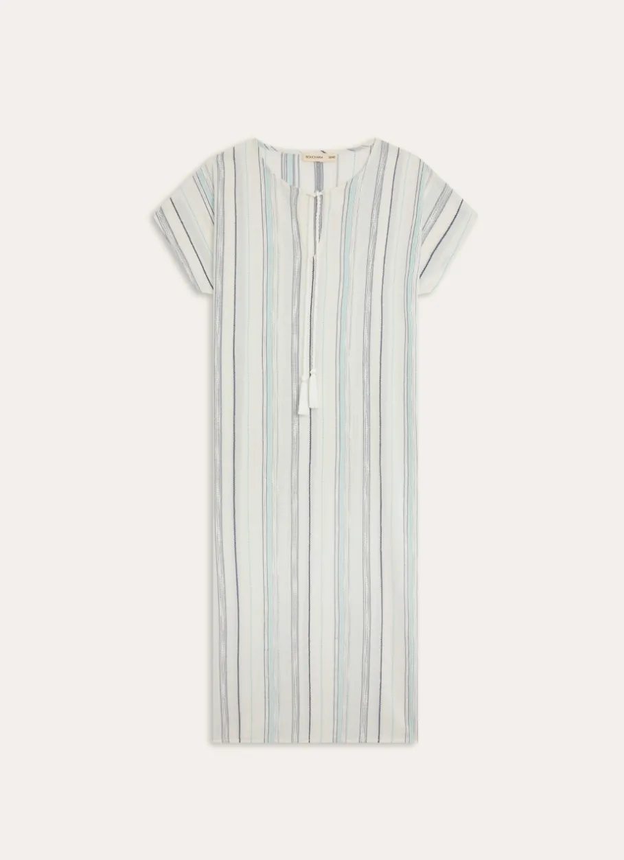 Cette tunique longue en coton fil teint, avec son joli détail pompon, est l’élément indispensable pour un look estival raffiné et confortable. Son tissu en coton assure une agréable légèreté, idéale pour les journées chaudes. Le fond écru avec son fil teint bleu lui donne une touche élégante et intemporelle.