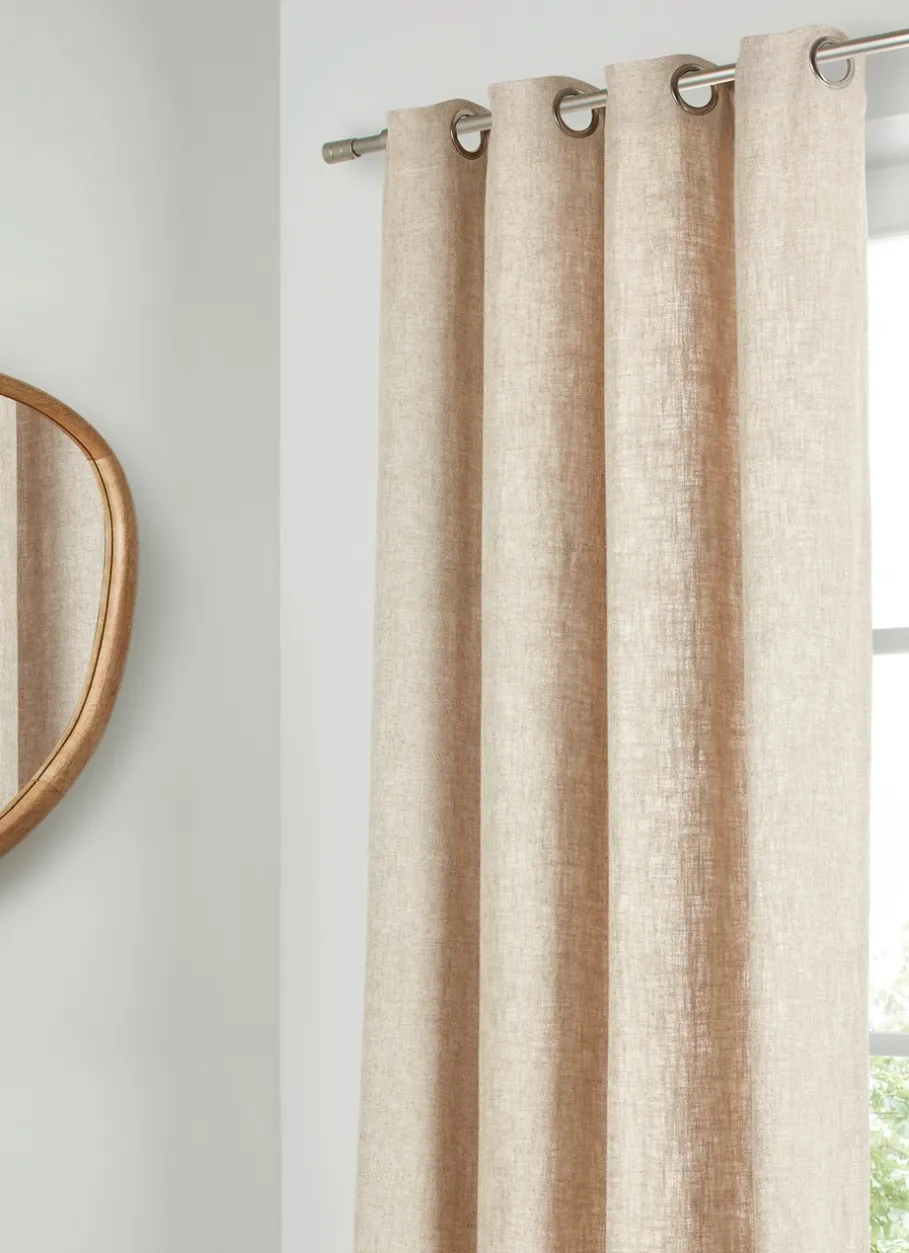 Rideau en viscose et lin, avec un tissage flammé pour donner du relief et de la matière. S’enfile sur une tringle à l’aide d’oeillets en argent mat. Dimensions (cm) : H260 x L140
