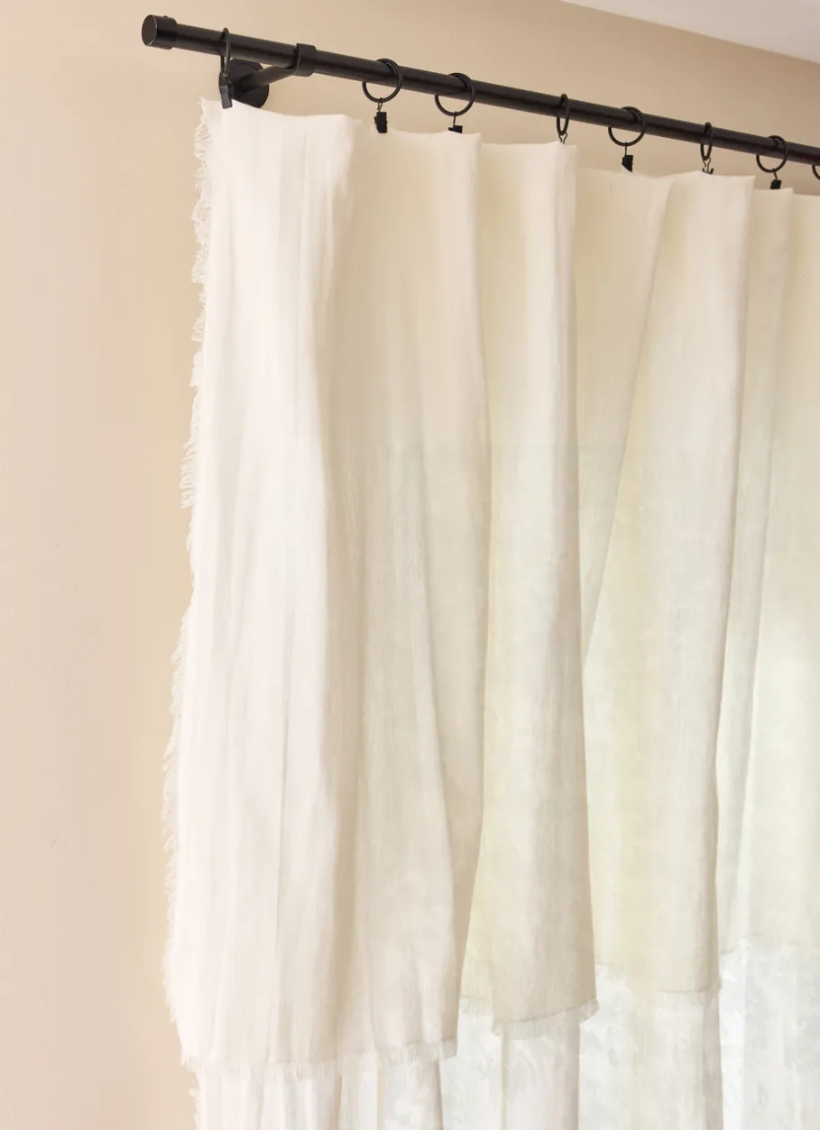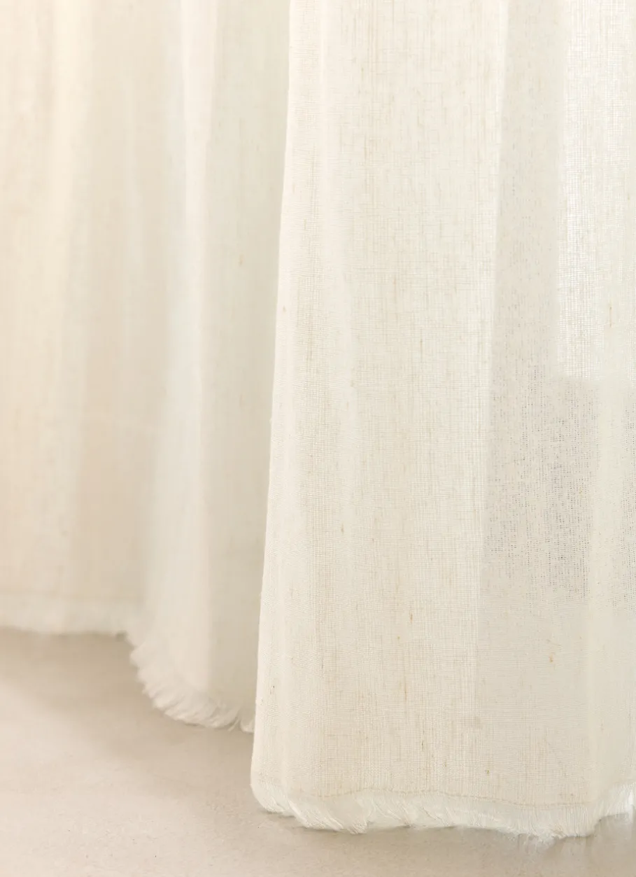 Ce rideau tamisant est idéal pour apporter une touche chaleureuse et naturelle à votre décoration. Sa matière légèrement froissée en coton, lyocell et lin laisse passer la lumière tout en préservant votre intimité. Son tombé fluide et sa finition frangée sur trois côtés ajoutent une note élégante et bohème à votre intérieur. Vendu à l’unité.Effet tamisant : Protège des regards extérieurs sans occulter la lumière.Finition : Franges sur trois côtés, finition droite.Fixation : À accrocher avec 10 anneaux pinces (espacés d’environ 9 cm, non fournis).