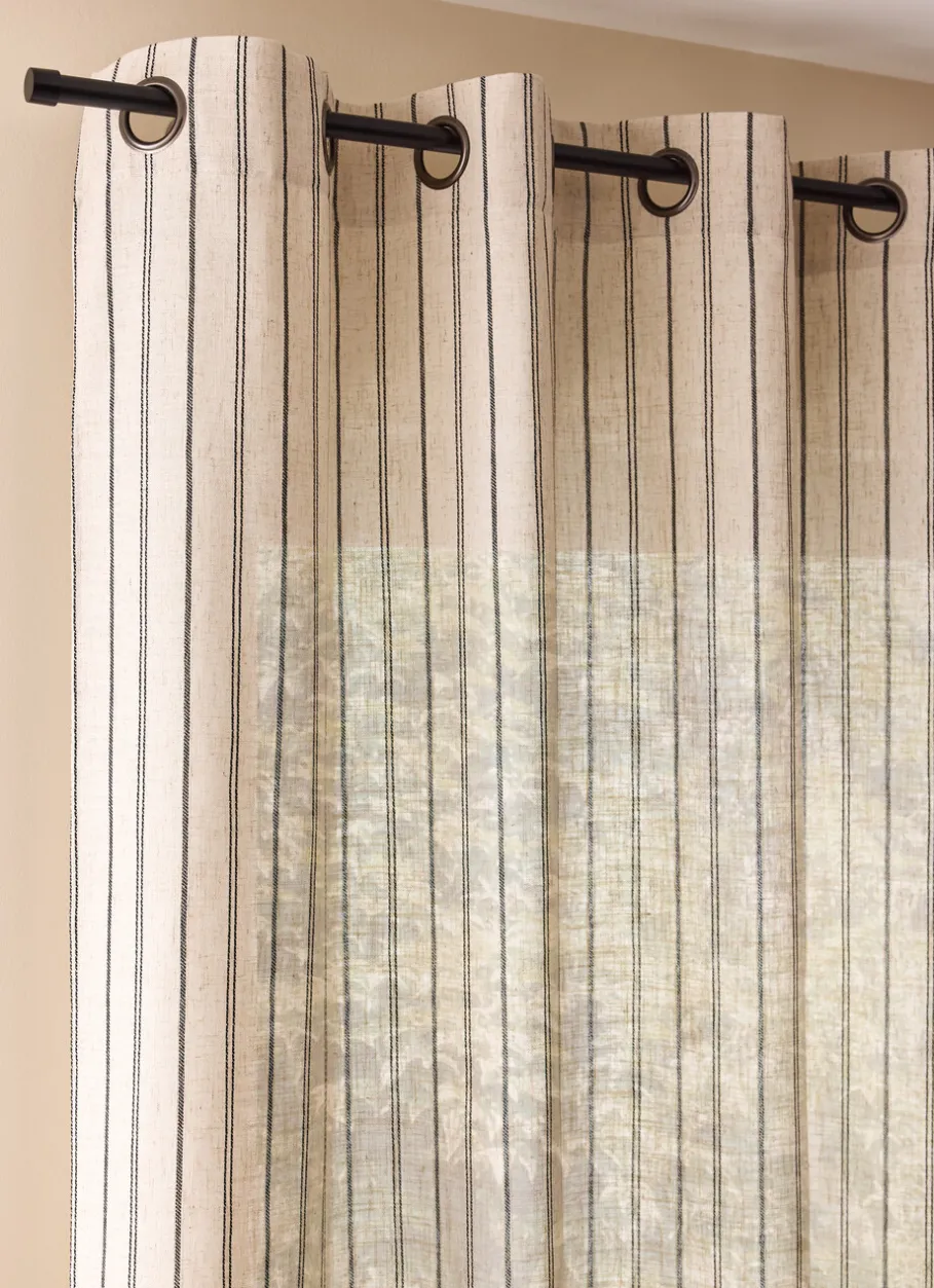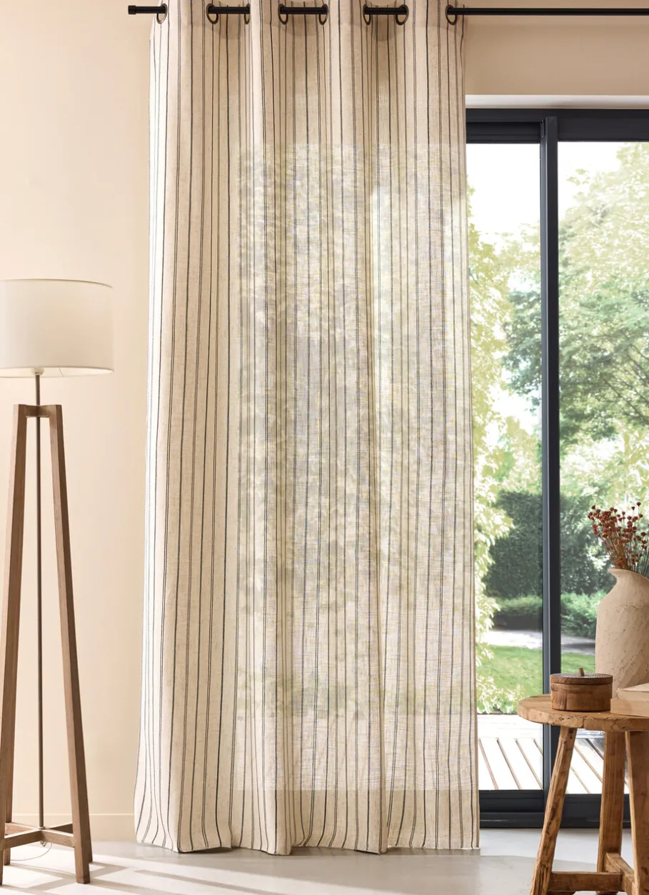 Ce rideau à œillets tramé et légèrement moucheté présente des rayures tissées contrastées noires sur un fond lin. Ce modèle tamisant permet de réduire l’intensité lumineuse tout en conservant une ambiance agréable dans votre intérieur. Idéal pour les pièces où l’on souhaite profiter d’un éclairage naturel agréable, comme le salon ou la salle à manger. Son style allie harmonieusement une esthétique naturelle et une élégance raffinée. Certifié Oeko-Tex®, il respecte des normes strictes en matière d’environnement. Vendu à l’unité. Finition : 8 œillets couleur canon de fusil de diamètre intérieur 40 mm. Dimensions (cm) : H260 x L140.