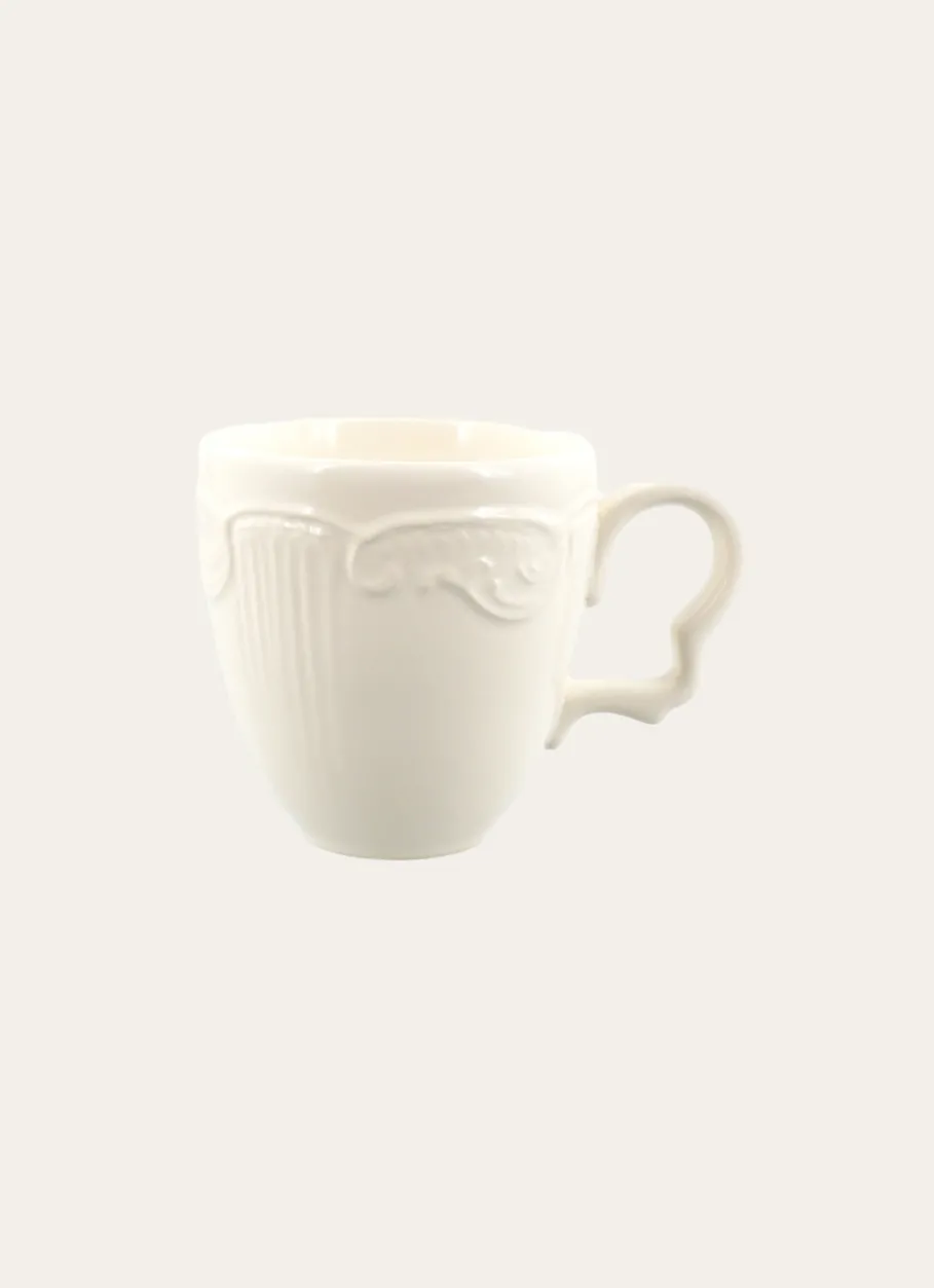 Mug en grès ornementé, d’inspiration classique. Raffiné et élégant pour un instant thé disitngué. Fabriqué au Portugal. Passe au lave-vaisselle et au micro-ondes. Dimensions (cm) : D9,7 x H13,6