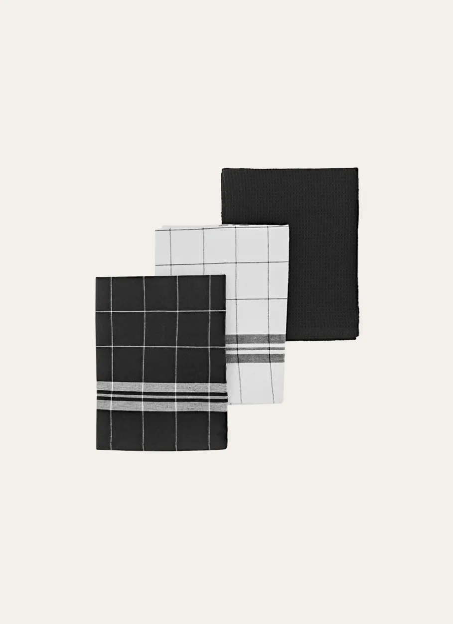 Lot de 3 torchons en coton : 2 à carreaux, tissés fil-teint et 1 torchon uni en nid d’abeille. Dimensions (cm) : H70 x L45. Existe en plusieurs coloris.