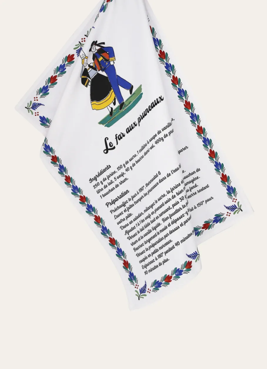 Torchon en coton imprimé style faïence avec la recette du far breton. Produit certifié Oeko-Tex. Dimensions (cm) : 50 x 70