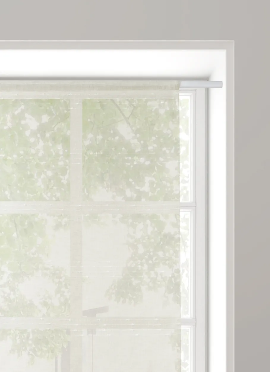 Voilage blanc à rayures horizontales en relief. Accrochage avec passe-tringle. Dimensions (cm) : L90 x H160