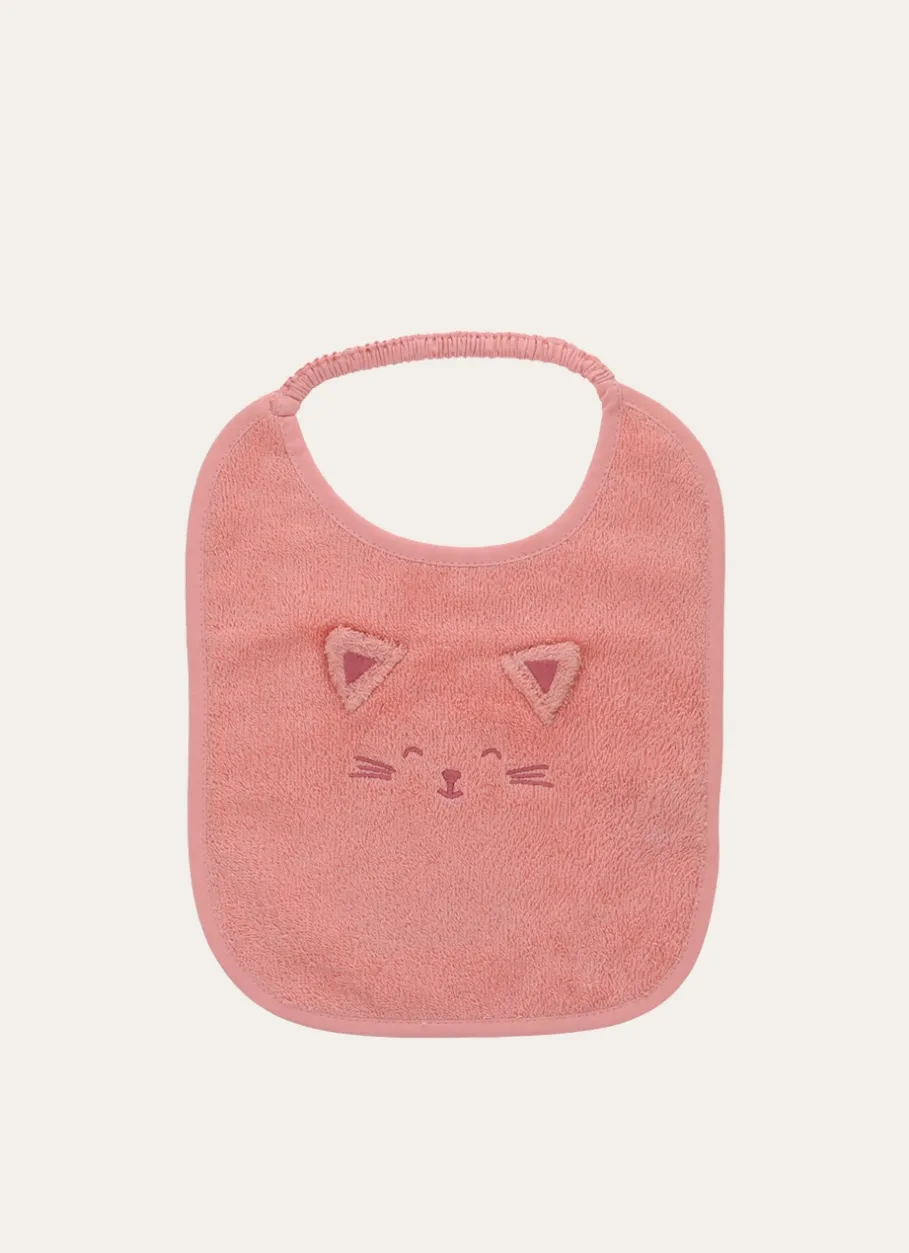 Adorable bavoir à nouer en éponge bouclette 360 gr/m², agrémenté d’une tête de chat brodée avec des oreilles en relief qui apportent une touche ludique et charmante. Confortable et absorbant, il protège efficacement les vêtements de bébé tout en restant doux pour sa peau. Certifié OEKO-TEX®, il respecte la peau des tout-petits et l’environnement. Existe en coloris rose et bleu. Dimensions (cm) : H32 x L26.