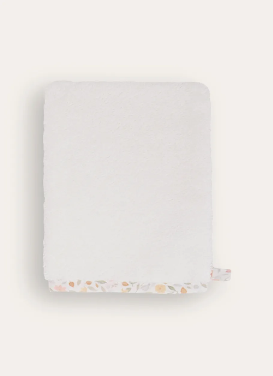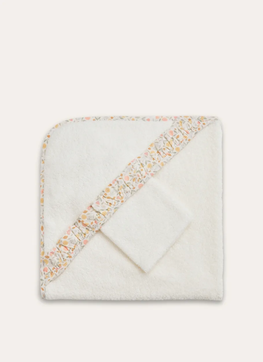 Set avec une cape de bain avec un volant en tissu à fleurs et un gant en éponge avec un biais à fleurs. Aussi adorable que confortable, ce set sera un cadeau de naissance idéal.Grammage : 360 gsm. Produit certifié Oeko-Tex®. Dimensions (cm) : 75 x 75 + 15 x 21