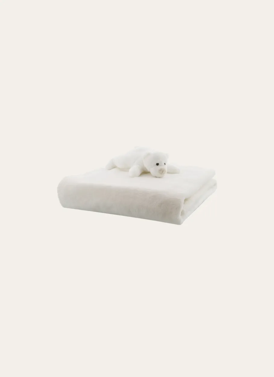 Plaid doudou blanc avec peluche en relief attachée au coin. Il suivra votre enfant partout. Idéal comme cadeau de naissance. Existe en plusieurs modèles. Dimensions (cm) : H70 x L90