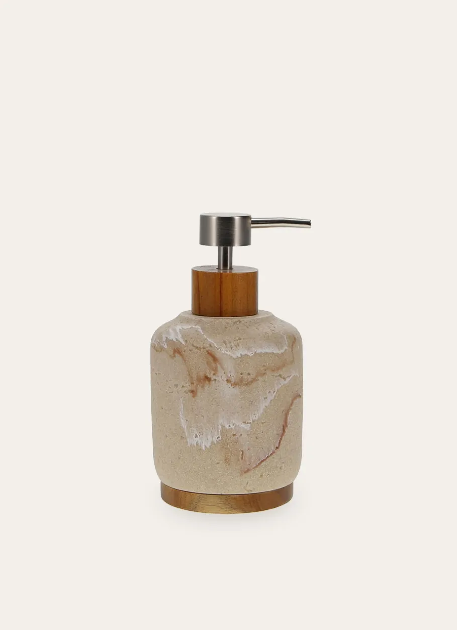 Apportez une touche élégante et naturelle à votre salle de bain avec ce distributeur de savon au design effet marbre, équipé d’un socle en bois pour plus de stabilité. Son réservoir permet un usage pratique et quotidien. Dimensions : H16,7 x D9,2 — Contenance : 408 ml.