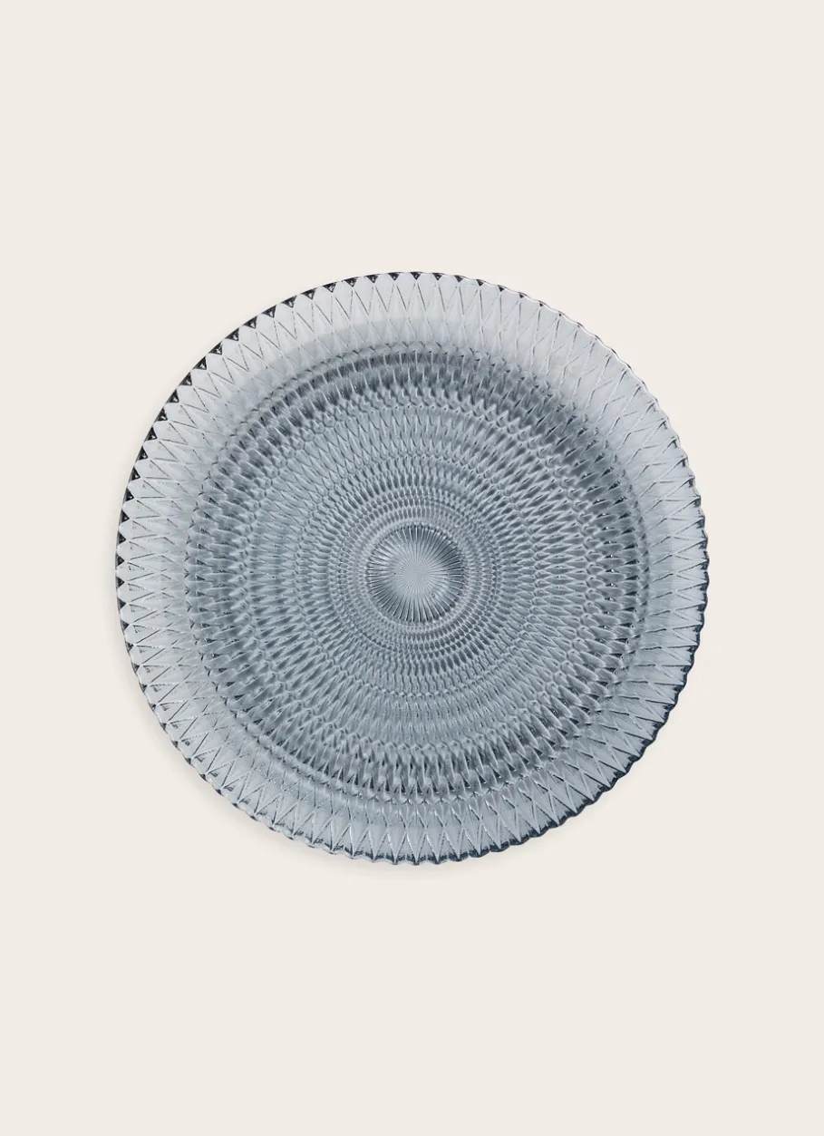 Assiette à dessert en verre au motif Art Déco pour des tables scintillantes et colorées. A compléter avec les assiettes à plat, l’assiette de présentation et les coupelles. Diamètre : 20 cm. Passe au micro-ondes. Ne passe pas au lave-vaisselle.