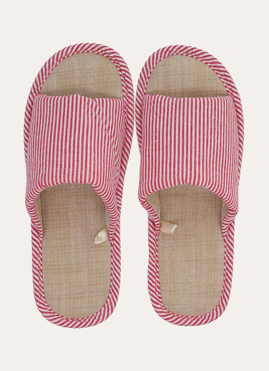 Adoptez un look estival et décontracté avec ce chausson ouvert à rayures. Parfait pour la maison ou les vacances, il allie confort et style grâce à son design bicolore rouge et blanc.