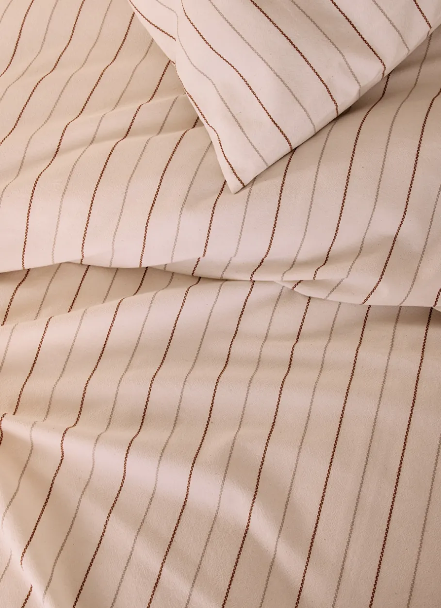 Apportez une touche de charme à votre chambre avec cette housse de couette en coton lavé, dans un coloris écru doux et agrémentée de fils tissés fantaisie beige et rouille. Confortable et élégante, sa texture en coton lavé de 155 g/m² offre une sensation de douceur durable, parfaite pour des nuits reposantes.La finition en forme de bouteille permet de border facilement la couette sous le matelas, assurant un maintien impeccable tout en apportant une touche pratique à votre lit.