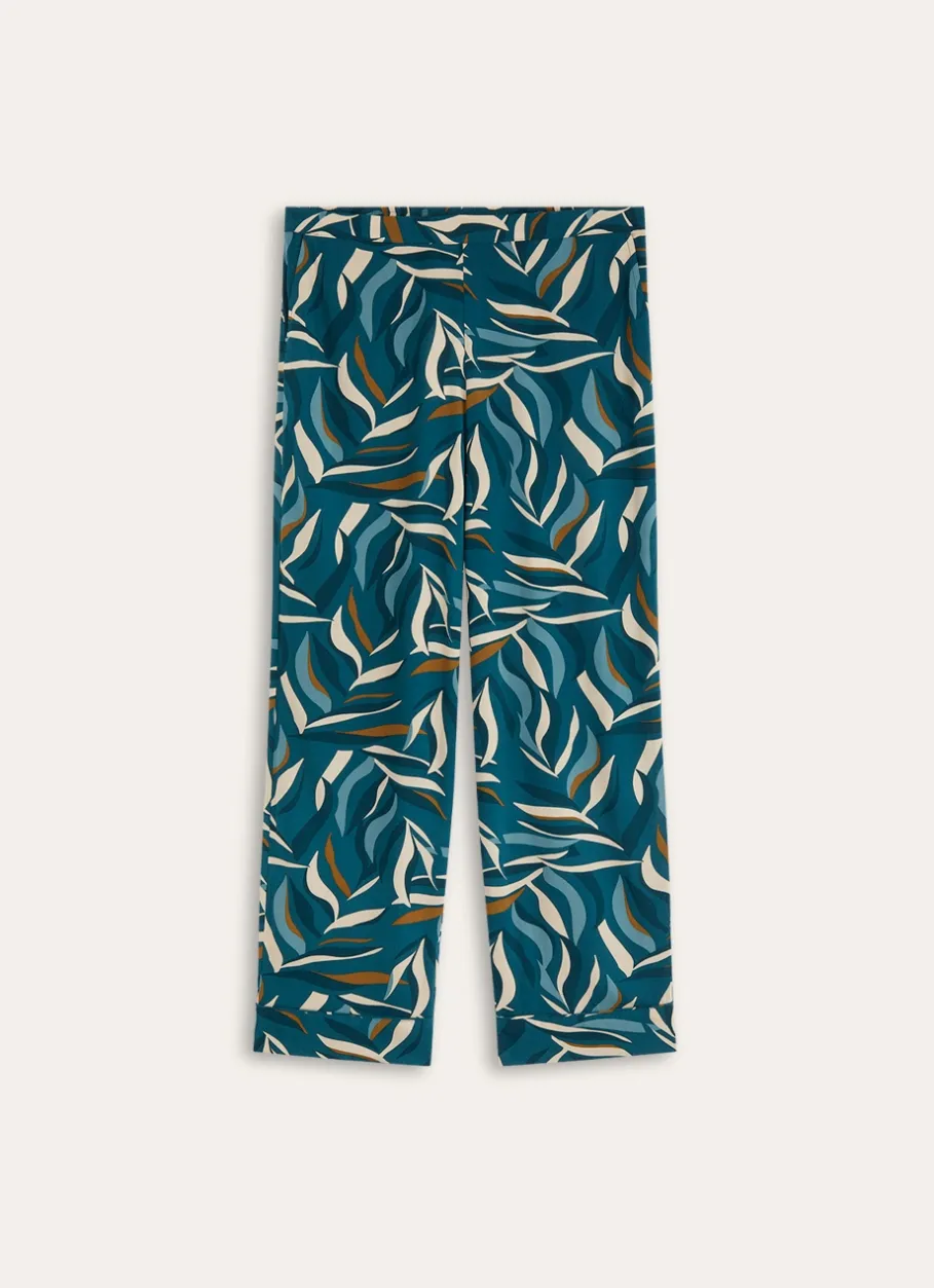 Pour un look élégant et écologique, notre pantalon droit à poches en viscose EcoVero imprimé feuillage multicolore sur fond vert est parfait pour vos moments de détente. Existe de la taille 34/36 à la taille 50/52.