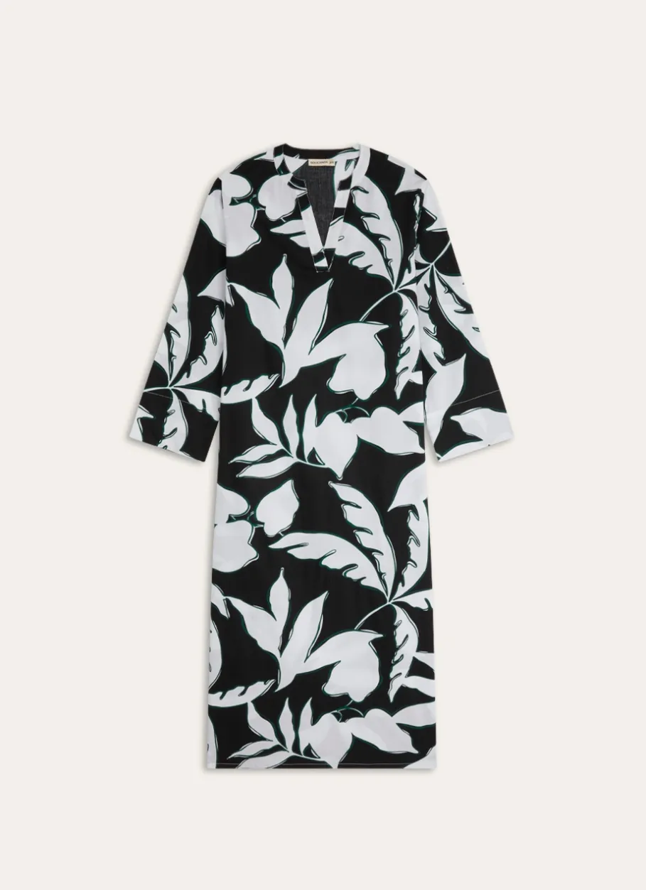 Cette robe longue en coton imprimé feuillages apporte une touche de fraîcheur et d’élégance. Son imprimé feuillage sur fond noir lui confère un look chic et naturel, parfait pour toutes les occasions estivales. Fabriquée en coton, elle offre un confort optimal tout au long de la journée.