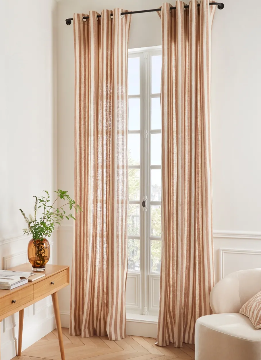 Apportez une touche graphique et naturelle à votre intérieur avec ce rideau à larges rayures bicolores, tissé sur un fond texturé flammé pour un effet matière subtil et authentique. Très léger et fluide, il est tamisant, idéal pour filtrer la lumière tout en préservant votre intimité. Confectionné en polyester et coton, il offre un tombé souple et une belle tenue grâce à sa qualité 180 gr/m². Facile à installer, il est doté de 8 œillets en métal finition argent mat (diamètre 40 mm), compatibles avec toutes les tringles standards. Certifié Oeko-Tex®, il garantit l’absence de substances nocives pour un intérieur sain. Disponible en coloris caramel ou kaki, il s’adapte à tous les styles de décoration. Vendu à l’unité. Dimensions (cm) : H300 x L140.