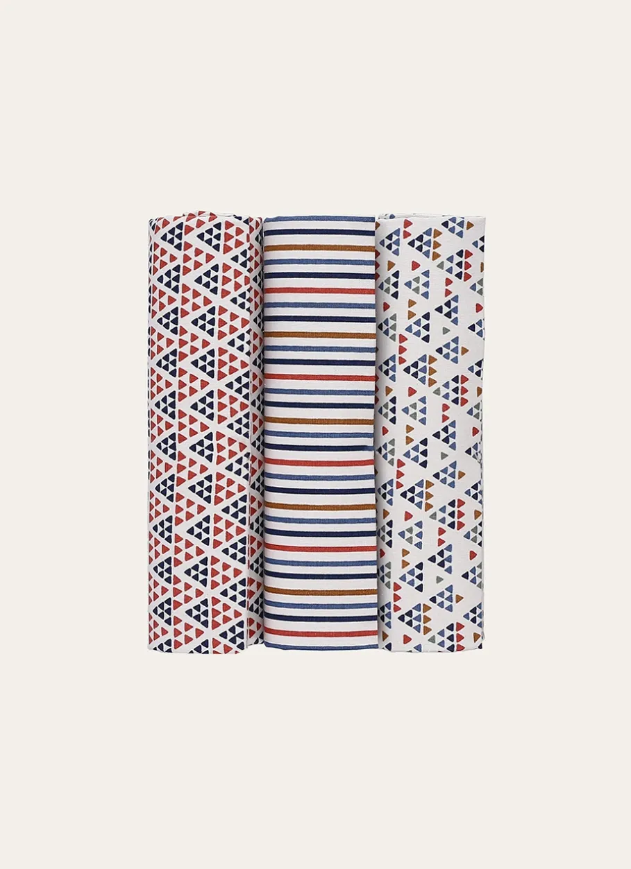 Sac de 3 torchons en coton, imprimés fantaisie, dont une rayure. Toile 185g/m². Imprimé au cadre. Poids du produit fini : 380g. Dimensions (cm) : Torchons 45 x 70 – Sac : 17 x 17 x 5.