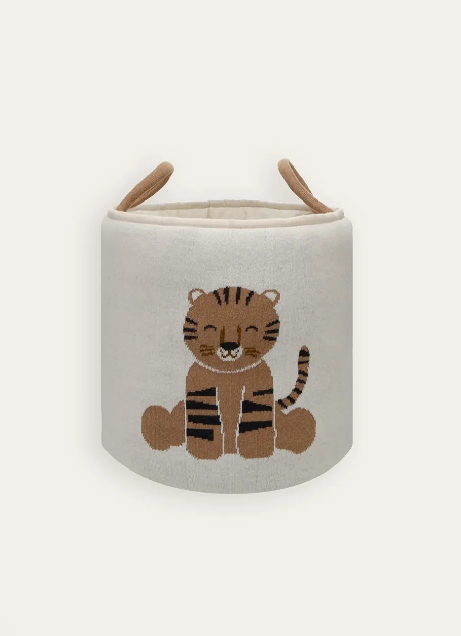 Adoptez ce panier de rangement en tricot de coton décoré d’un petit tigre. Ludique et tendance, les enfants pourront y ranger leurs jouets, livres ou peluches en un tour de main. Pratique, il possède 2 poignées pour le transporter partout ! Garanti sans substances nocives pour la santé et l’environnement, ce joli panier est certifié selon la norme OEKO-TEX®. Dimensions (cm) : H30 x D26