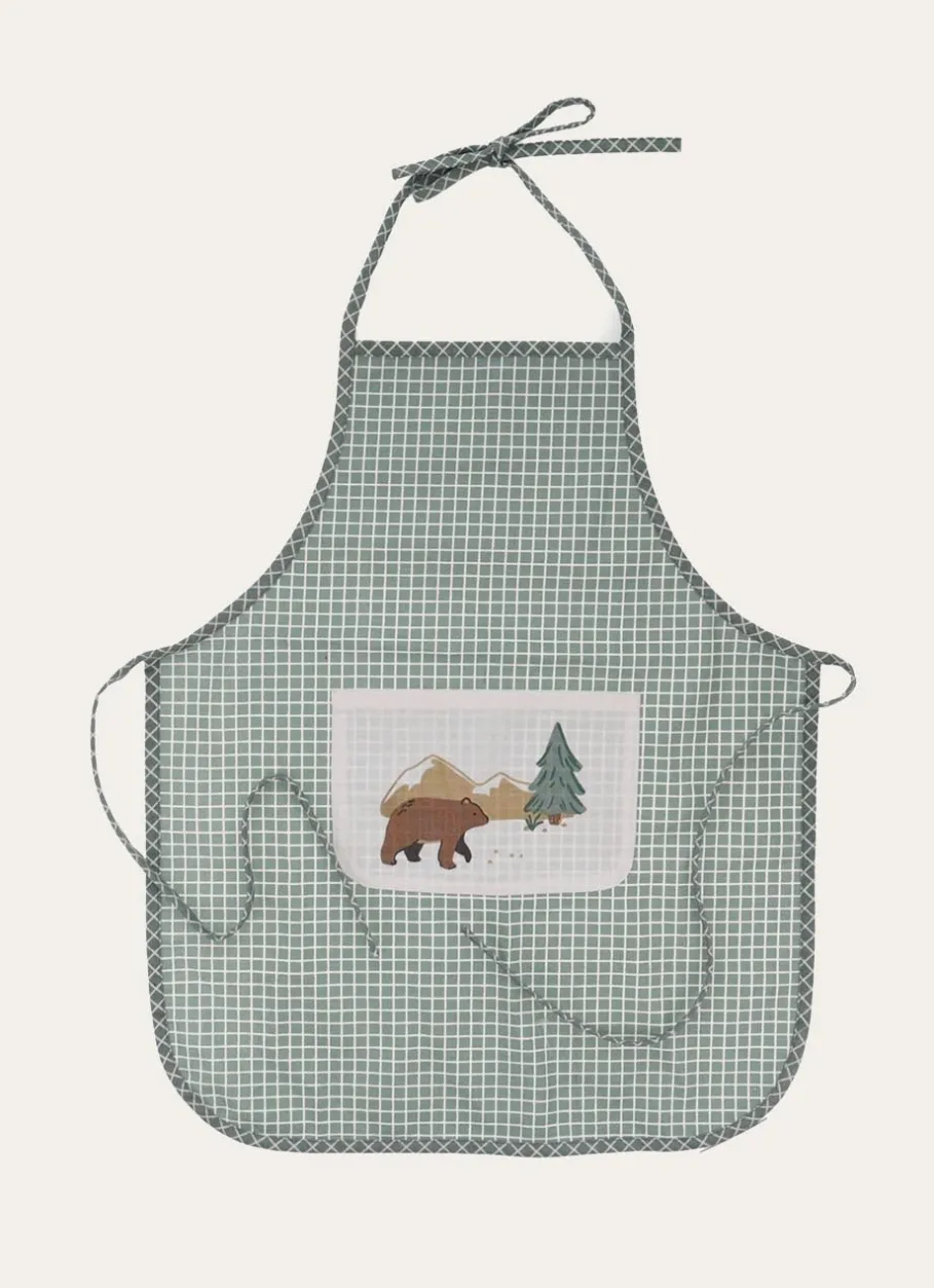 Tablier enfant en coton enduit, orné d’un imprimé à carreaux verts et d’une grande poche frontale décorée d’un motif ours et forêt. Résistant et facile à nettoyer, il est idéal pour accompagner les petits chefs dans leurs aventures culinaires. Il se noue facilement au cou et à la taille pour un ajustement confortable. Certifié OEKO-TEX®, il garantit l’absence de substances nocives pour la peau des enfants. Dimensions (cm) : H50 x L41.