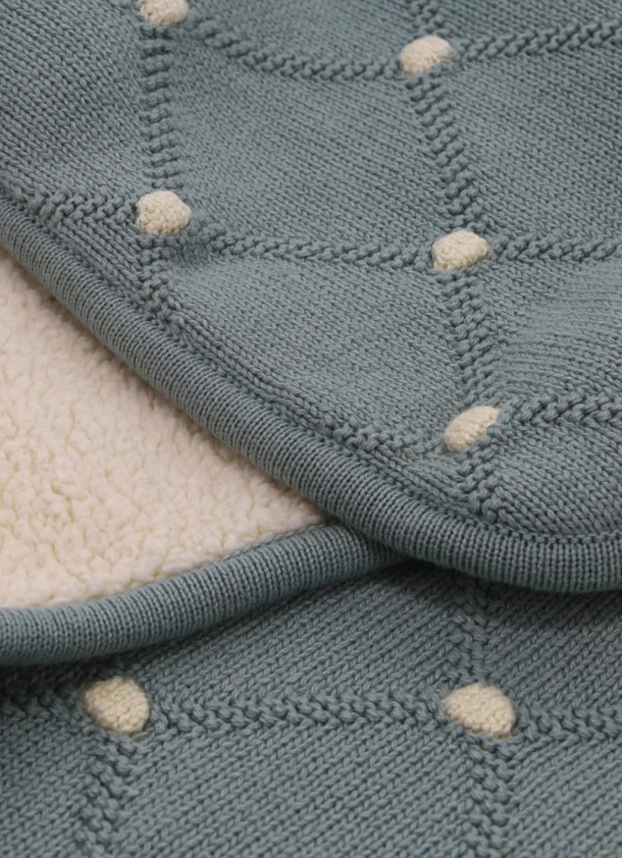 Plaid enfant en tricot de coton, délicatement ponctué de pois et de torsades, doublé d’un revers en sherpa d’une douceur enveloppante. Son toucher moelleux et ses finitions soignées en font un cocon de tendresse pour accompagner les plus jolis rêves. Certifié OEKO-TEX®, il garantit l’absence de substances nocives et respecte les peaux sensibles des tout-petits. Proposé en deux teintes naturelles et élégantes : naturel doux et vert mousse. Dimensions : H100 x L80 cm.